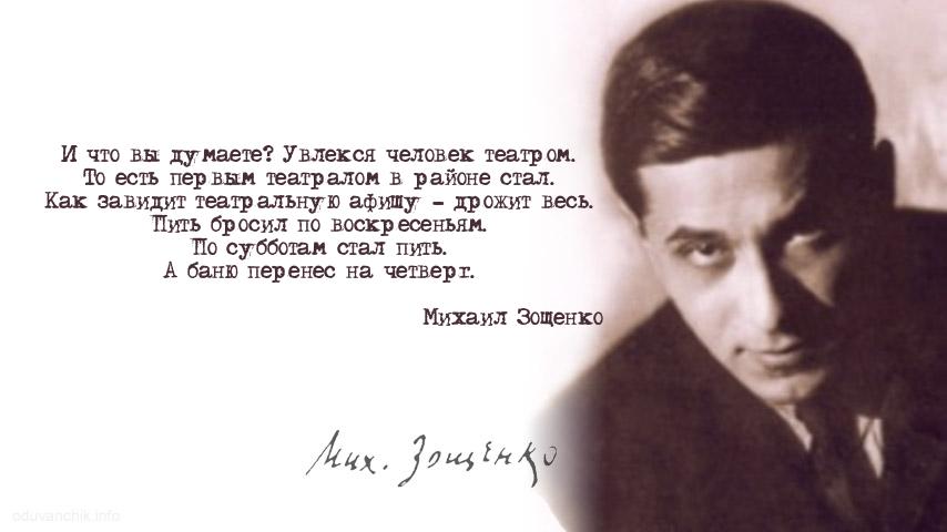 | И что вы думаете? Увлекся человек театром. То есть первым театралом в районе стал. Как завидит театральную афишу — дрожит весь. Пить бросил по воскресеньям. По субботам стал пить. А баню перенес на четверг. |