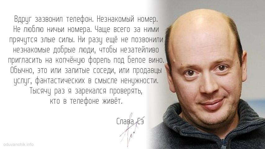 «Вдруг зазвонил телефон. Незнакомый номер. Не люблю ничьи номера. Чаще всего за ними прячутся злые силы. Ни разу ещё не позвонили незнакомые добрые люди, чтобы незатейливо пригласить на копчёную форель под белое вино. Обычно, это или залитые соседи, или продавцы услуг, фантастических в смысле ненужности. Тысячу раз я зарекался проверять, кто в телефоне живёт.»