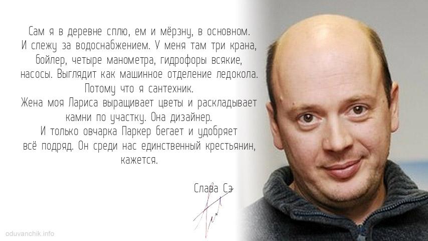 | Сам я в деревне сплю, ем и мёрзну, в основном. И слежу за водоснабжением. У меня там три крана, бойлер, четыре манометра, гидрофоры всякие, насосы. Выглядит как машинное отделение ледокола. Потому что я сантехник. Жена моя Лариса выращивает цветы и раскладывает камни по участку. Она дизайнер. И только овчарка Паркер бегает и удобряет всё подряд. Он среди нас единственный крестьянин, кажется. |