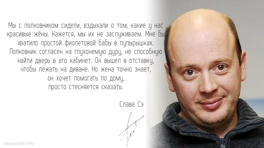 | Мы с полковником сидели, вздыхали о том, какие у нас красивые жёны. Кажется, мы их не заслуживаем. Мне бы хватило простой фиолетовой бабы в пупырышках. Полковник согласен на глухонемую дуру, не способную найти дверь в его кабинет. Он вышел в отставку, чтобы лежать на диване. Но жена точно знает, он хочет помогать по дому, просто стесняется сказать. |