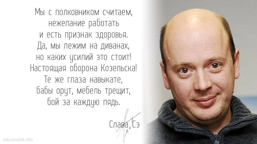 «Мы с полковником считаем, нежелание работать и есть признак здоровья. Да, мы лежим на диванах, но каких усилий это стоит! Настоящая оборона Козельска! Те же глаза навыкате, бабы орут, мебель трещит, бой за каждую пядь.»