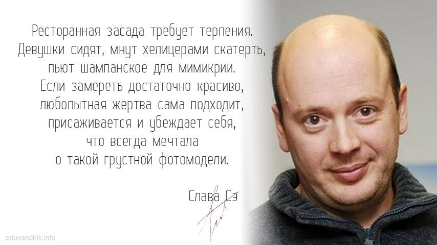 «Ресторанная засада требует терпения. Девушки сидят, мнут хелицерами скатерть, пьют шампанское для мимикрии. Если замереть достаточно красиво, любопытная жертва сама подходит, присаживается и убеждает себя, что всегда мечтала о такой грустной фотомодели.»
