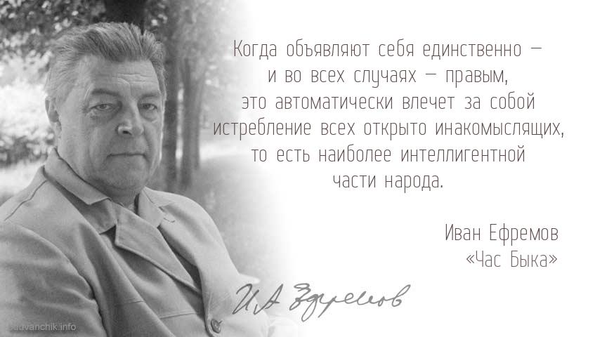 | Когда объявляют себя единственно — и во всех случаях — правым, это автоматически влечет за собой истребление всех открыто инакомыслящих, то есть наиболее интеллигентной части народа. |