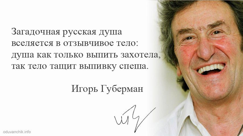 | Загадочная русская душа вселяется в отзывчивое тело: душа как только выпить захотела, так тело тащит выпивку спеша. |